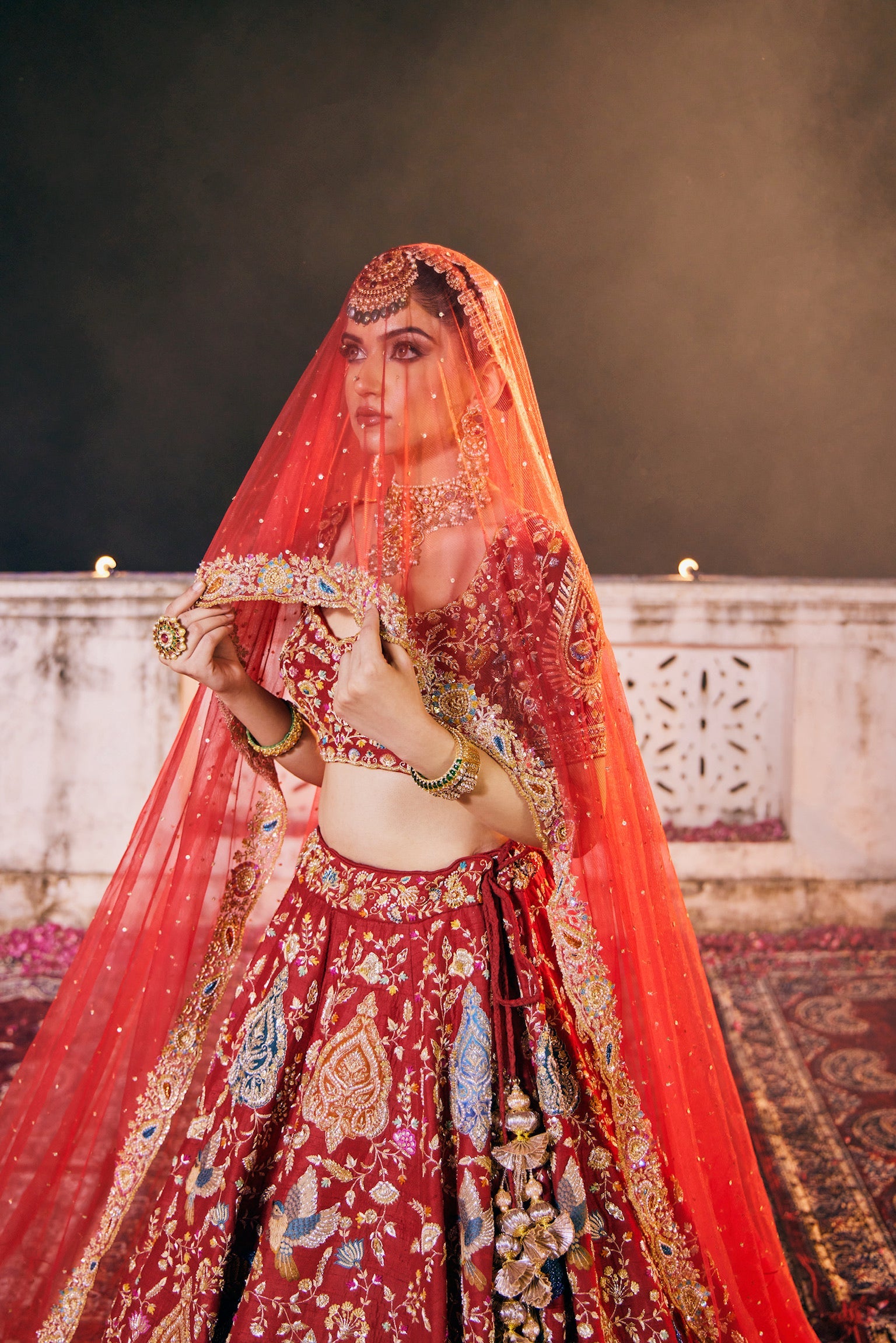 Bridal Lehenga featuring colourful patch motifs and intricate peacock embroidery, along with golden jaal work.