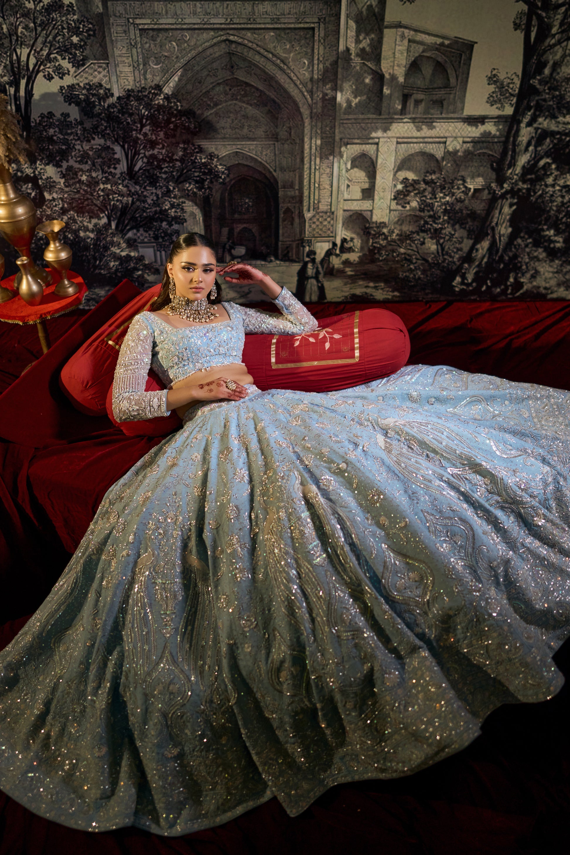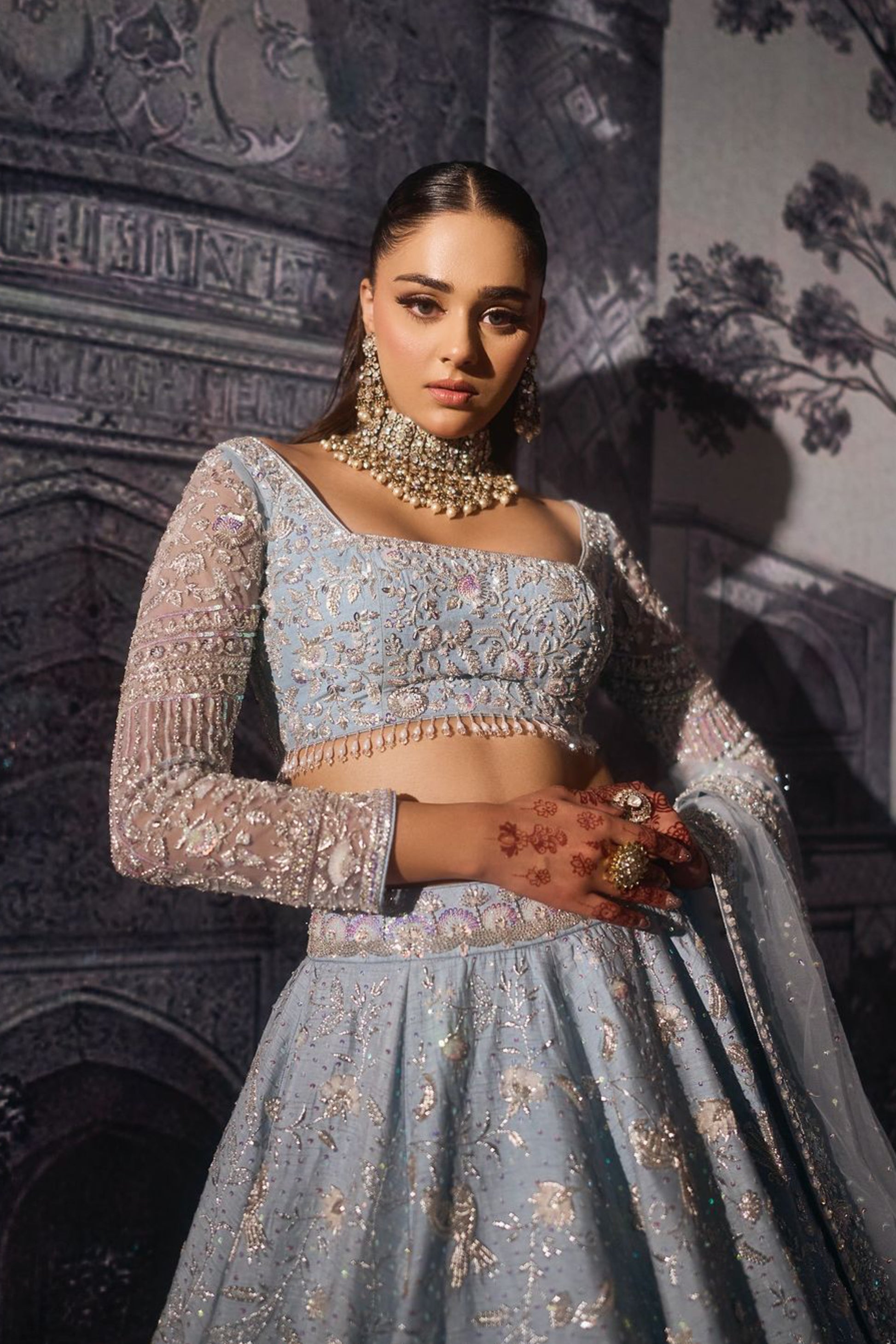 Weaved in silver spark skirt in Aqua with square net blouse and motif dupatta.