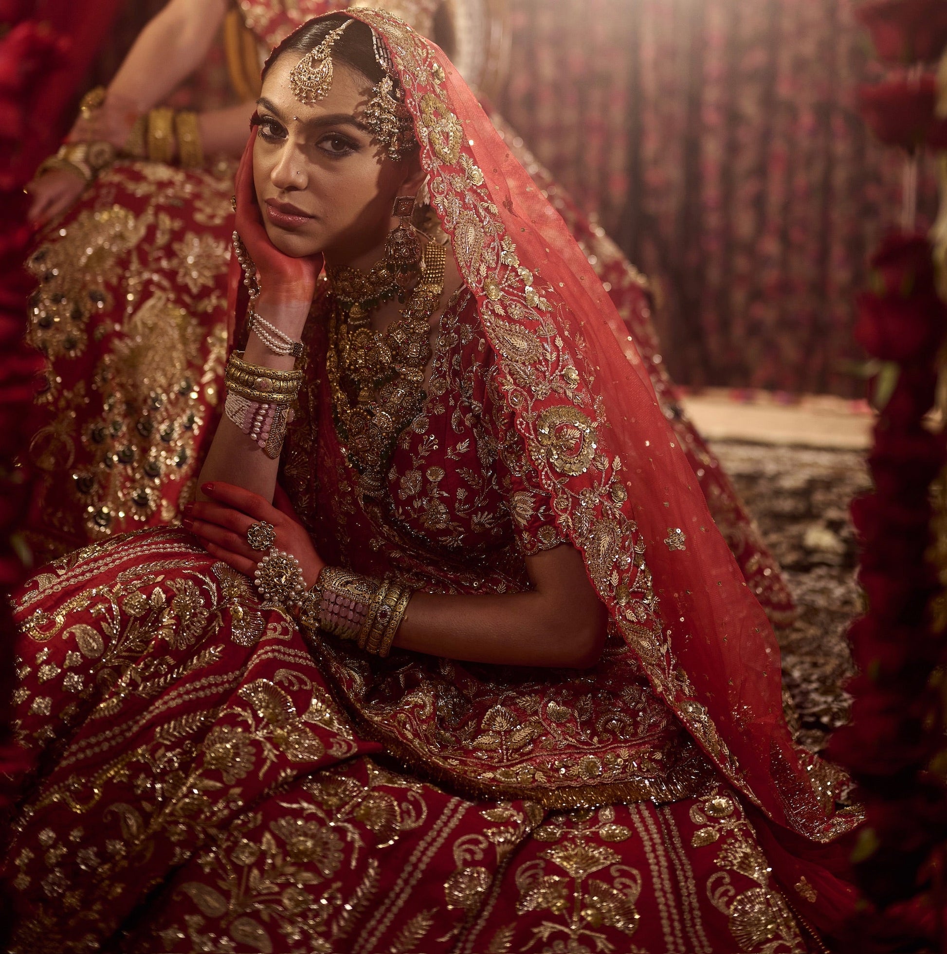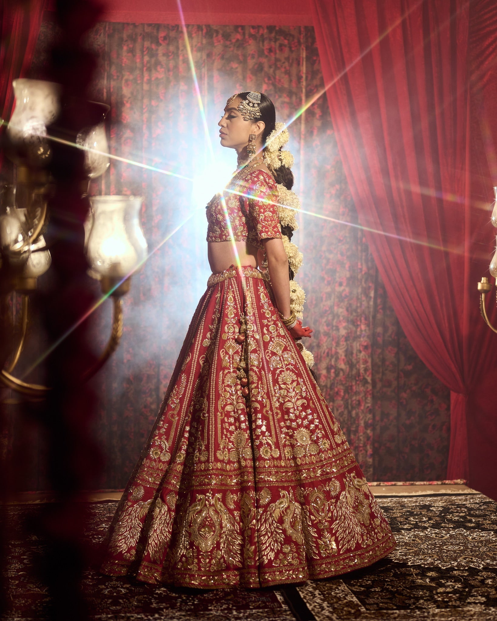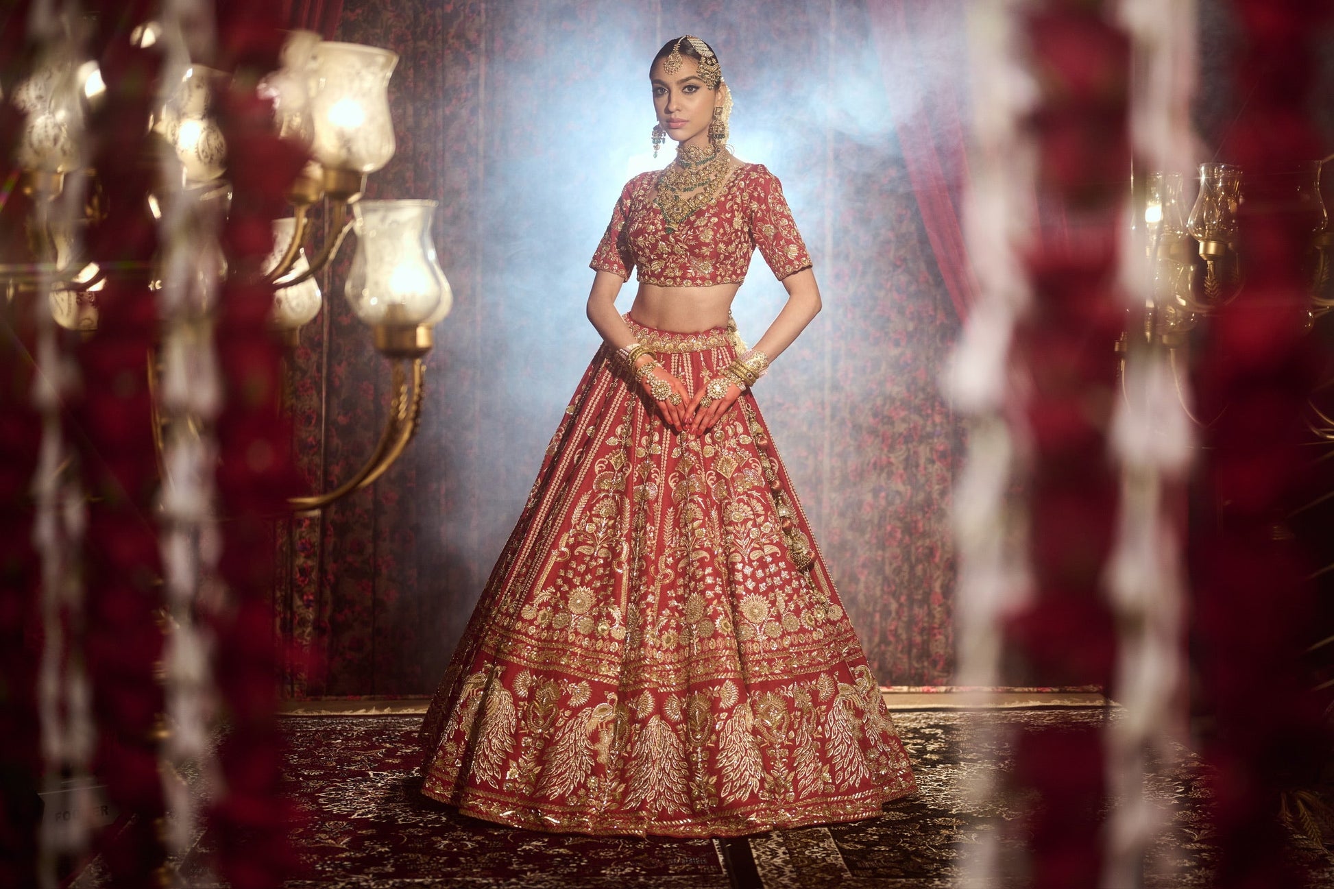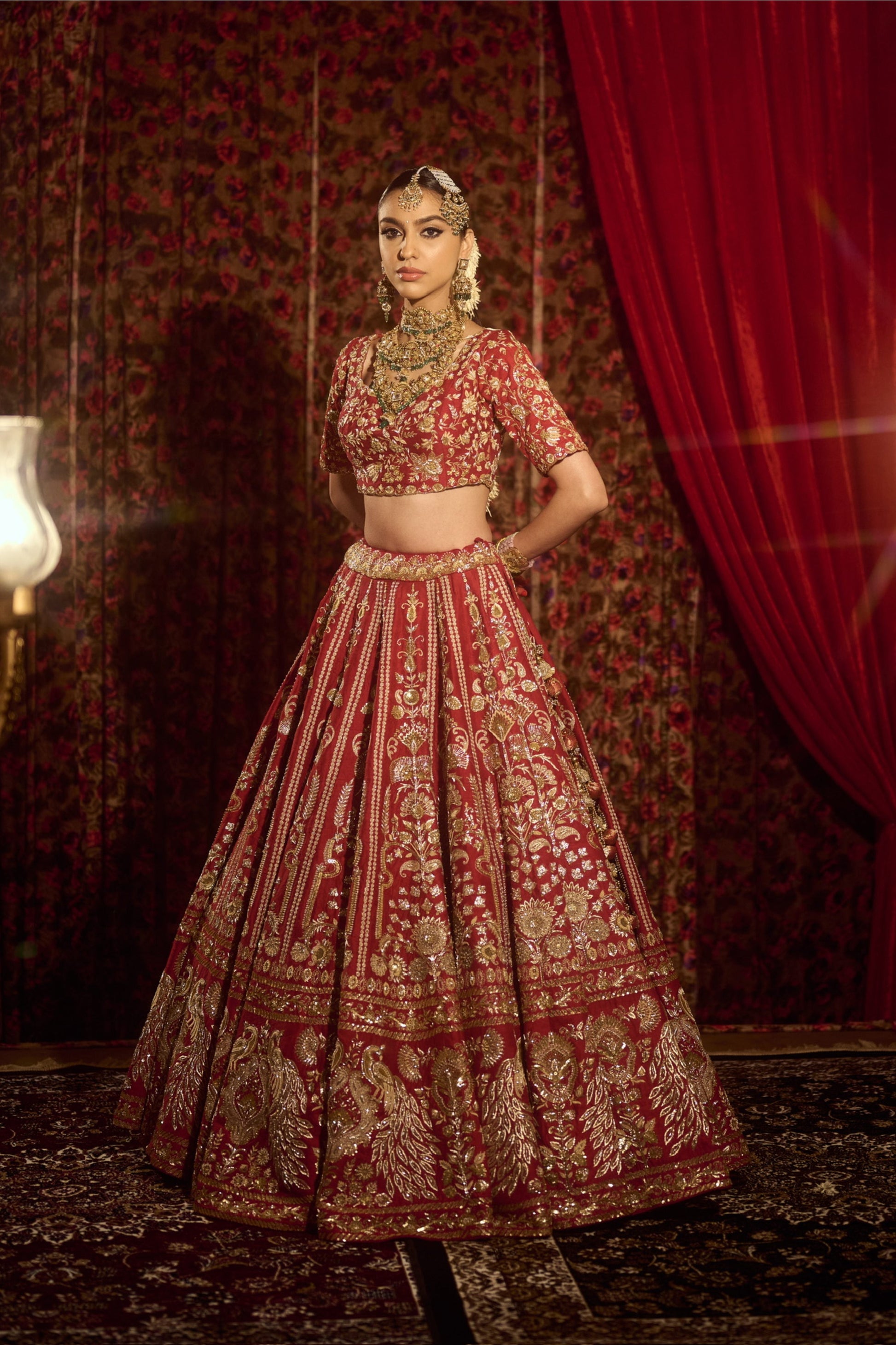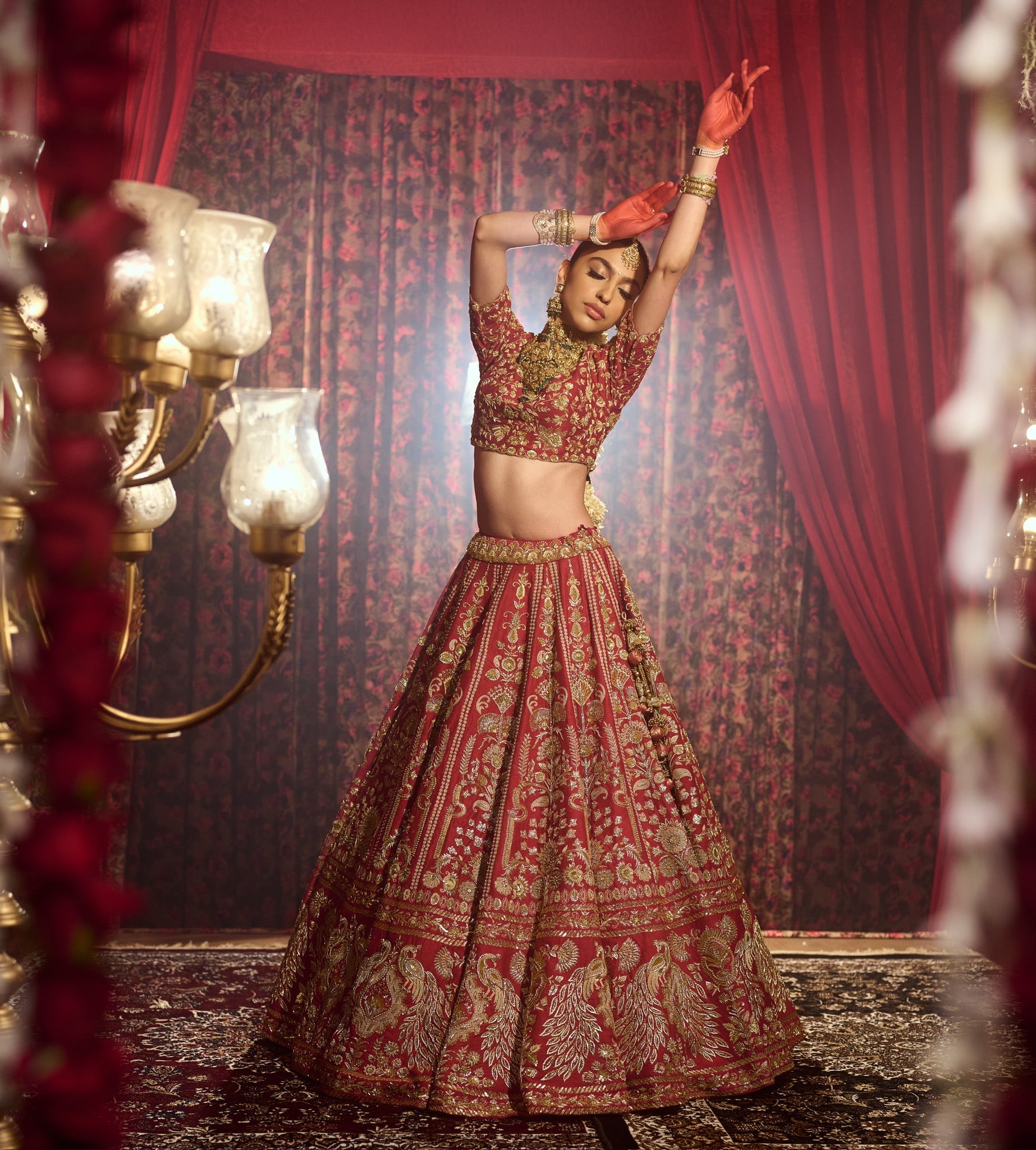 Bridal kalidar joda featuring intricate peacock motifs embroidered in golden.
