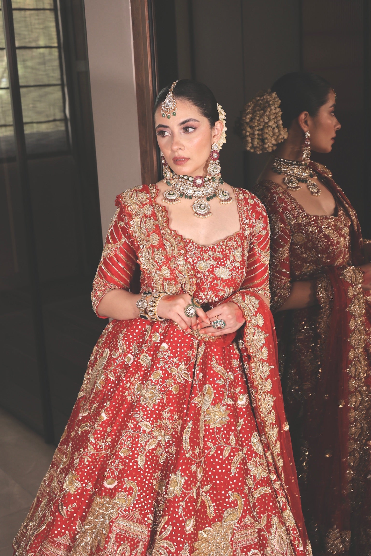 Bridal Anarkali with skirt featuring a baarati motif on the anarkali and the skirt featuring a geometrical embroidery.