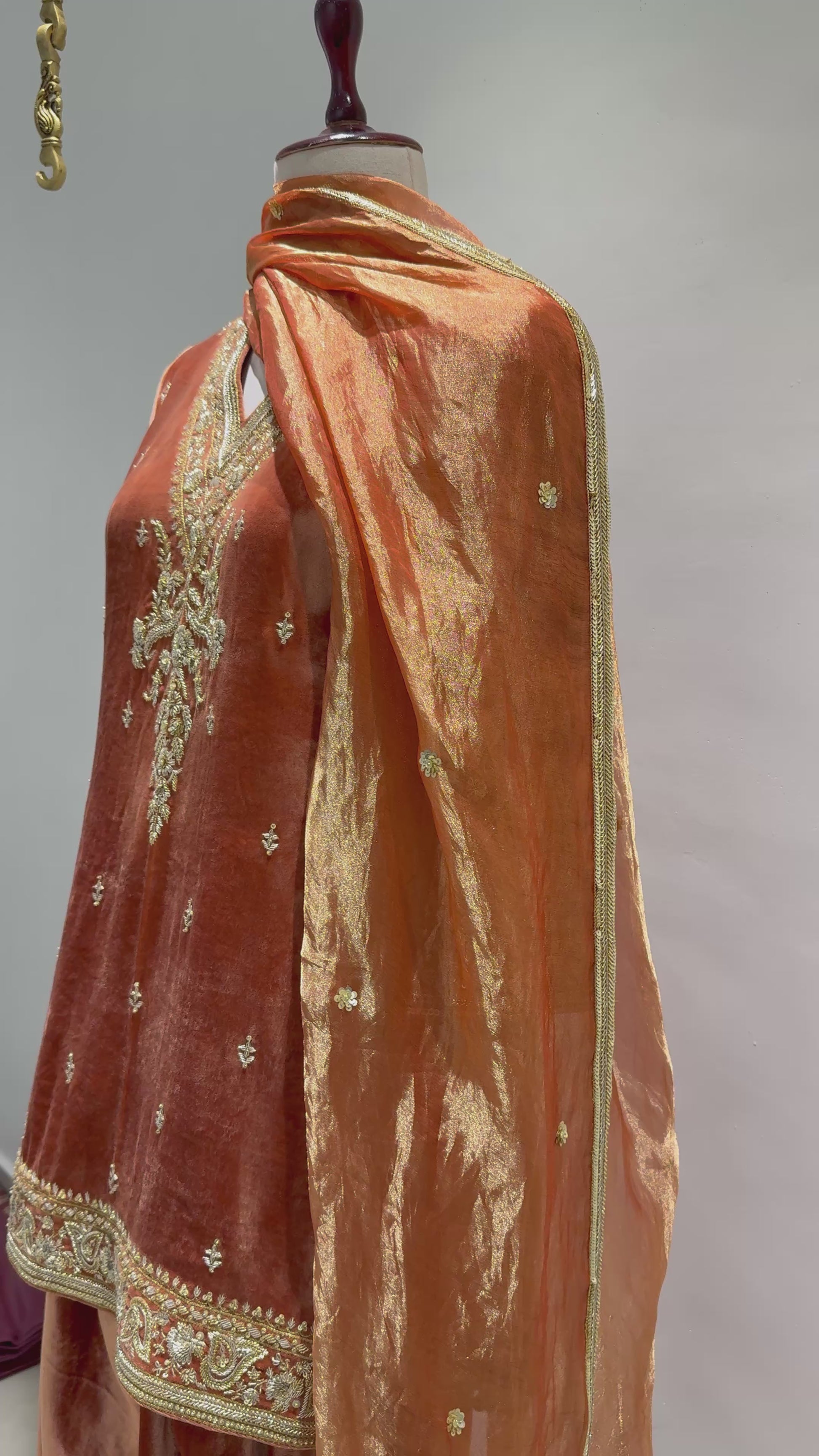 Burnt orange velvet with structure — a kallidar that carries tradition through clean lines and a gaze that stays.