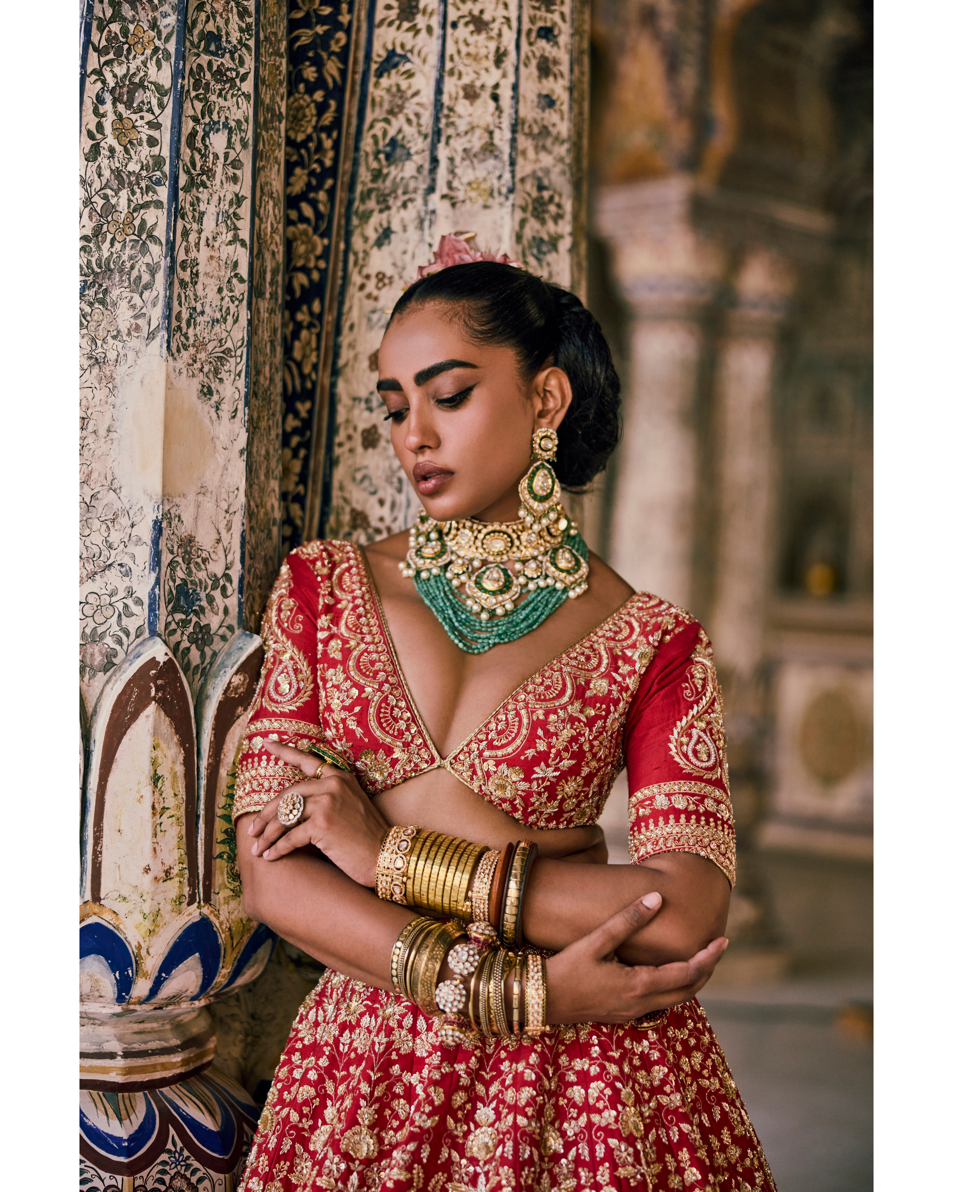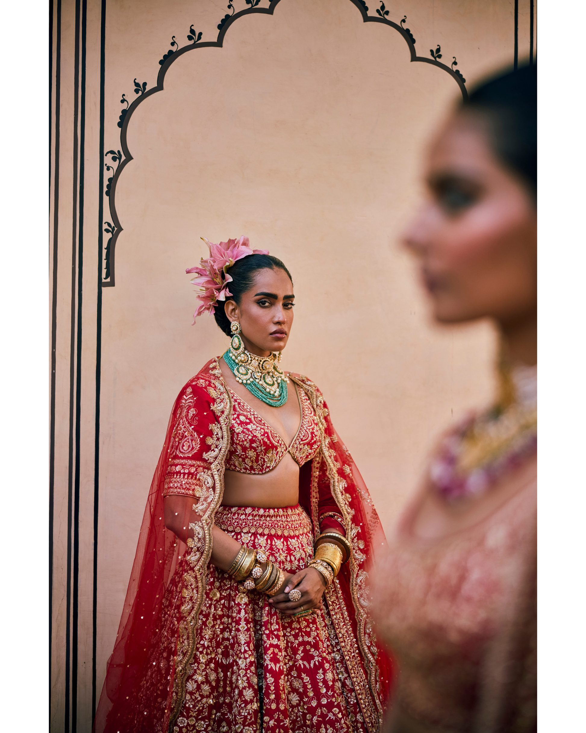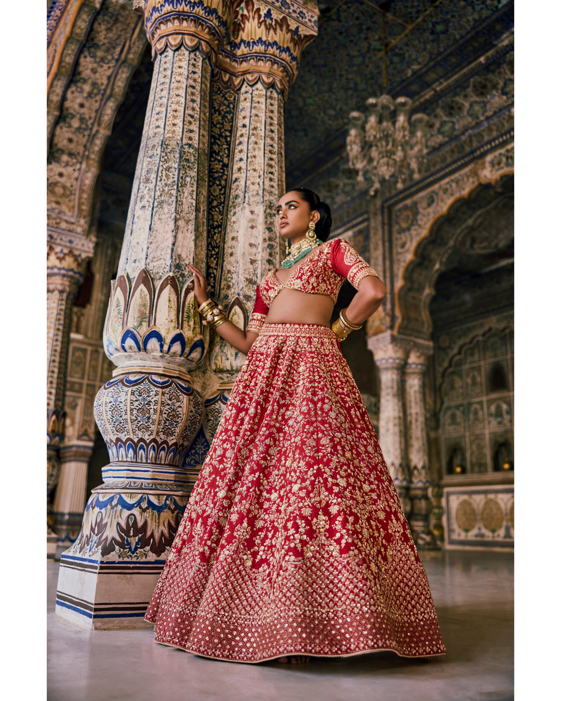 This lehenga is crafted in shades of golden floral designs with butta border paired with a heavy blouse, a Dupatta & a veil.