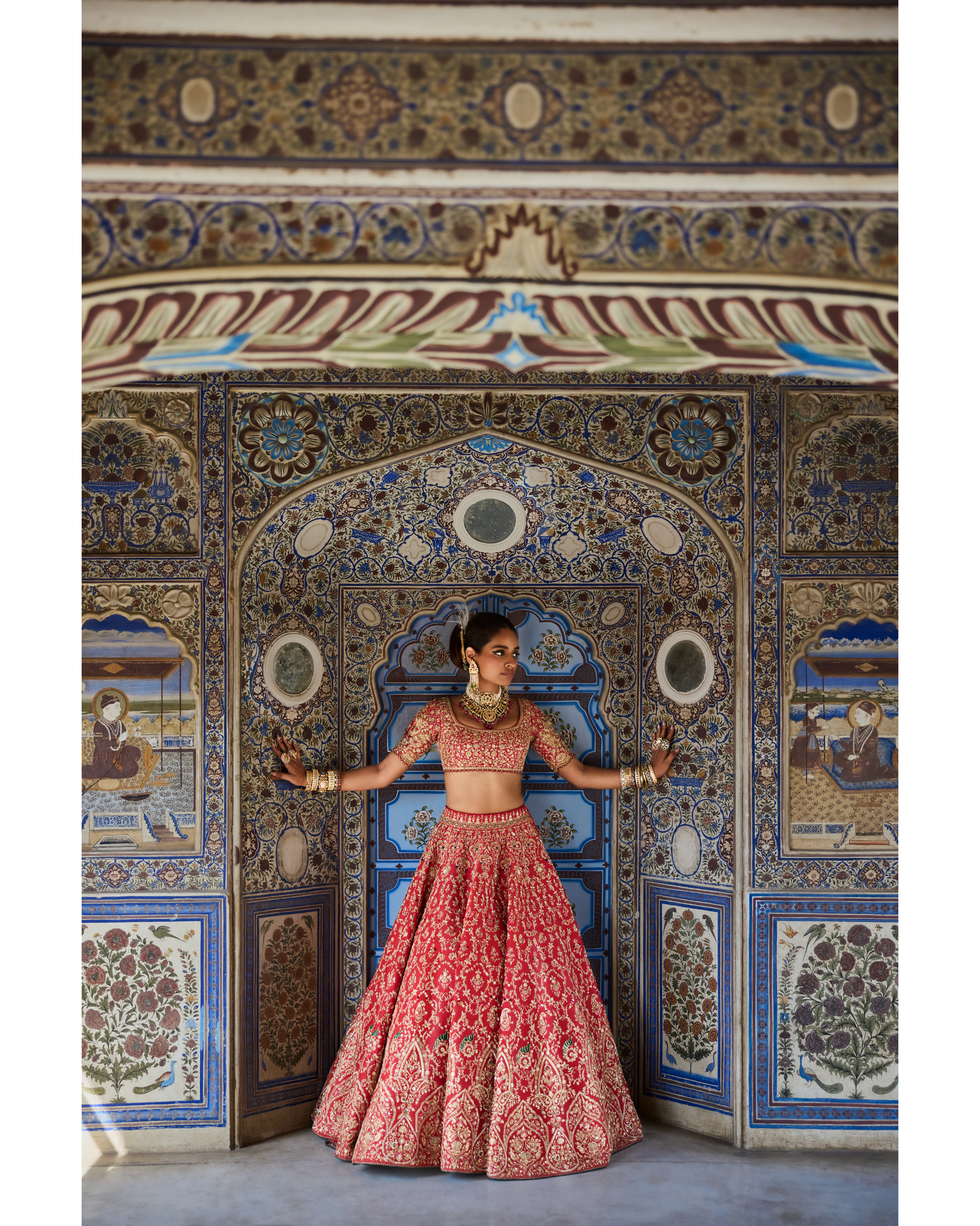 This lehenga is embellished in paisley border with peacocks & overall symmetric jaal paired with heavy blouse, a dupatta & a veil.