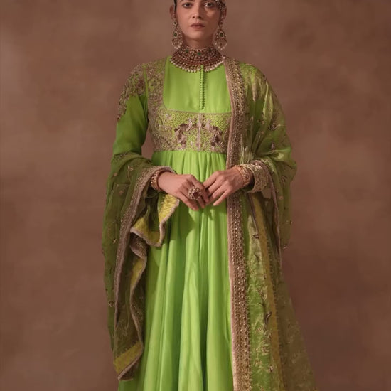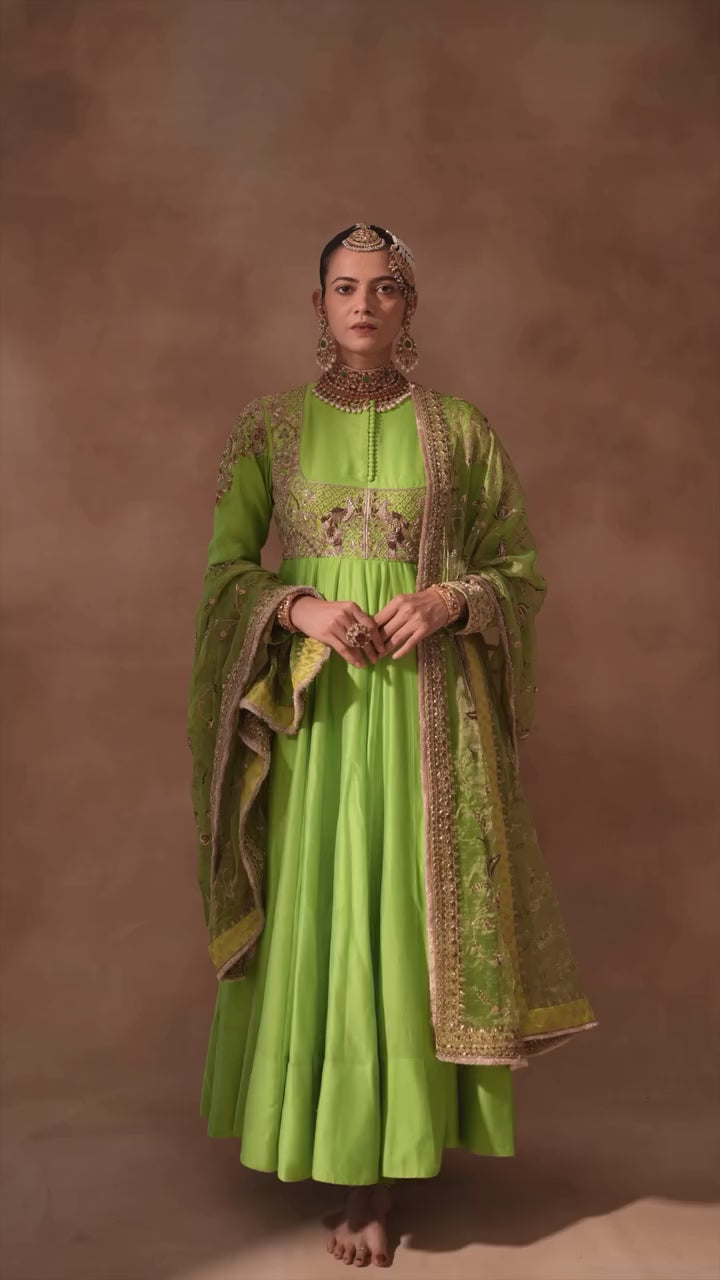 Anarkali with heavy intricate designs with embroidered skirt and dupatta.