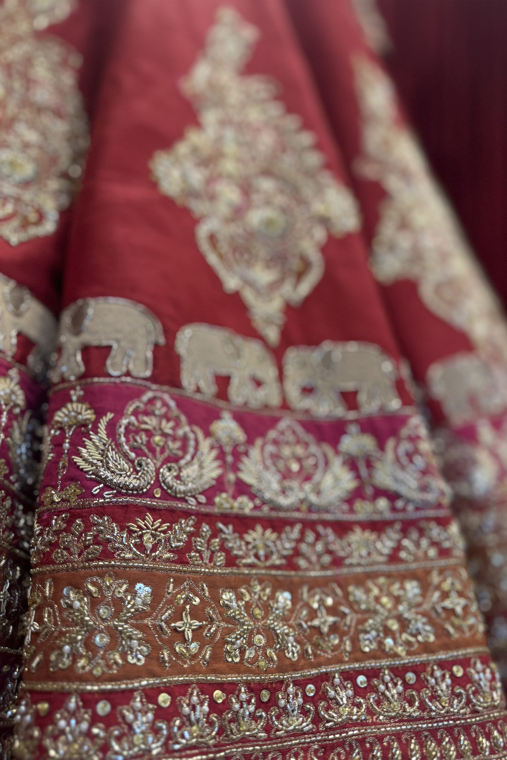 Pitch Red Paisely Bridal Anarkali with elephant patched border and golden motif Skirt.