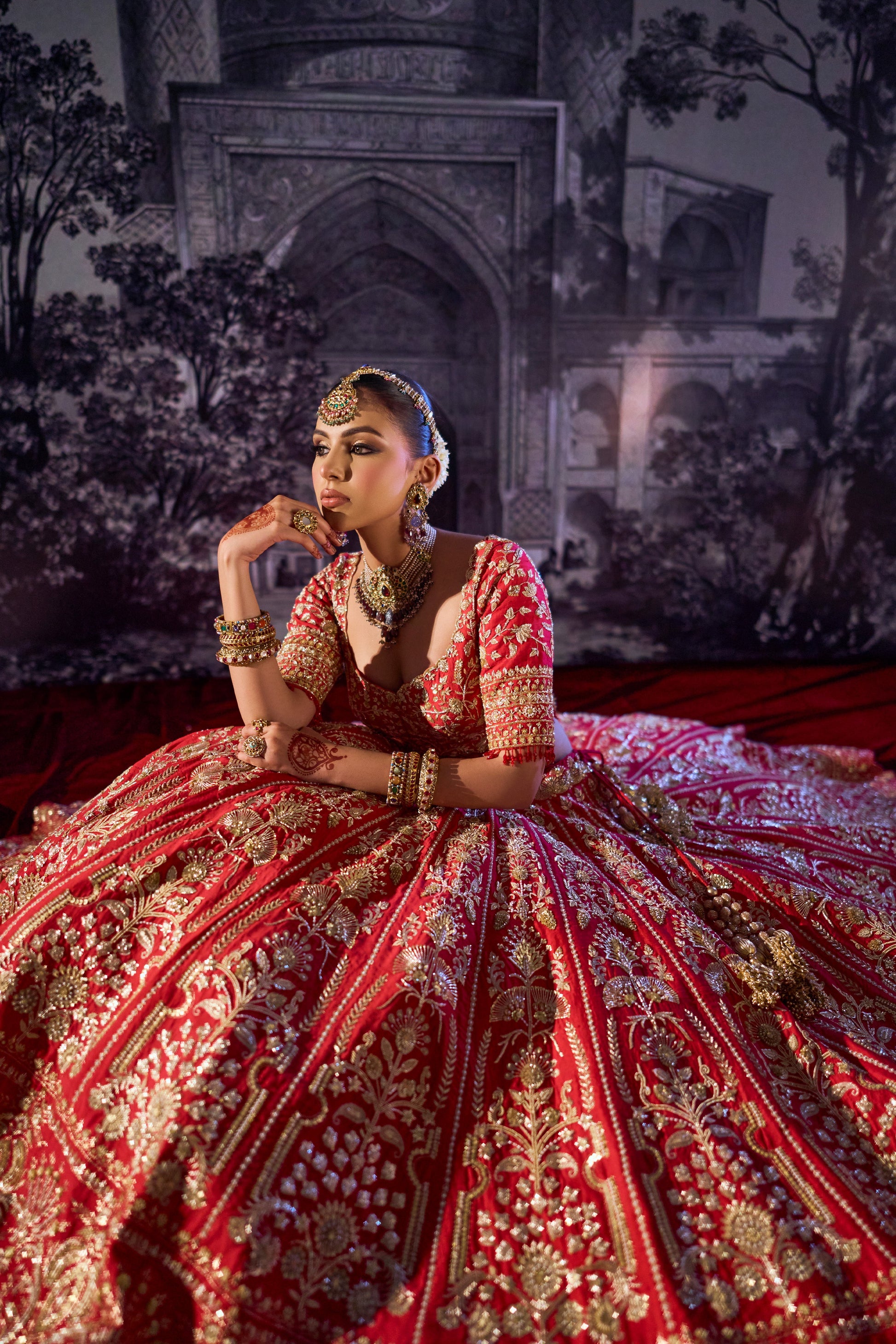 Bridal Kalidar Joda featuring intricate patterns embroidered in golden, along with a detailed blouse and dupatta.