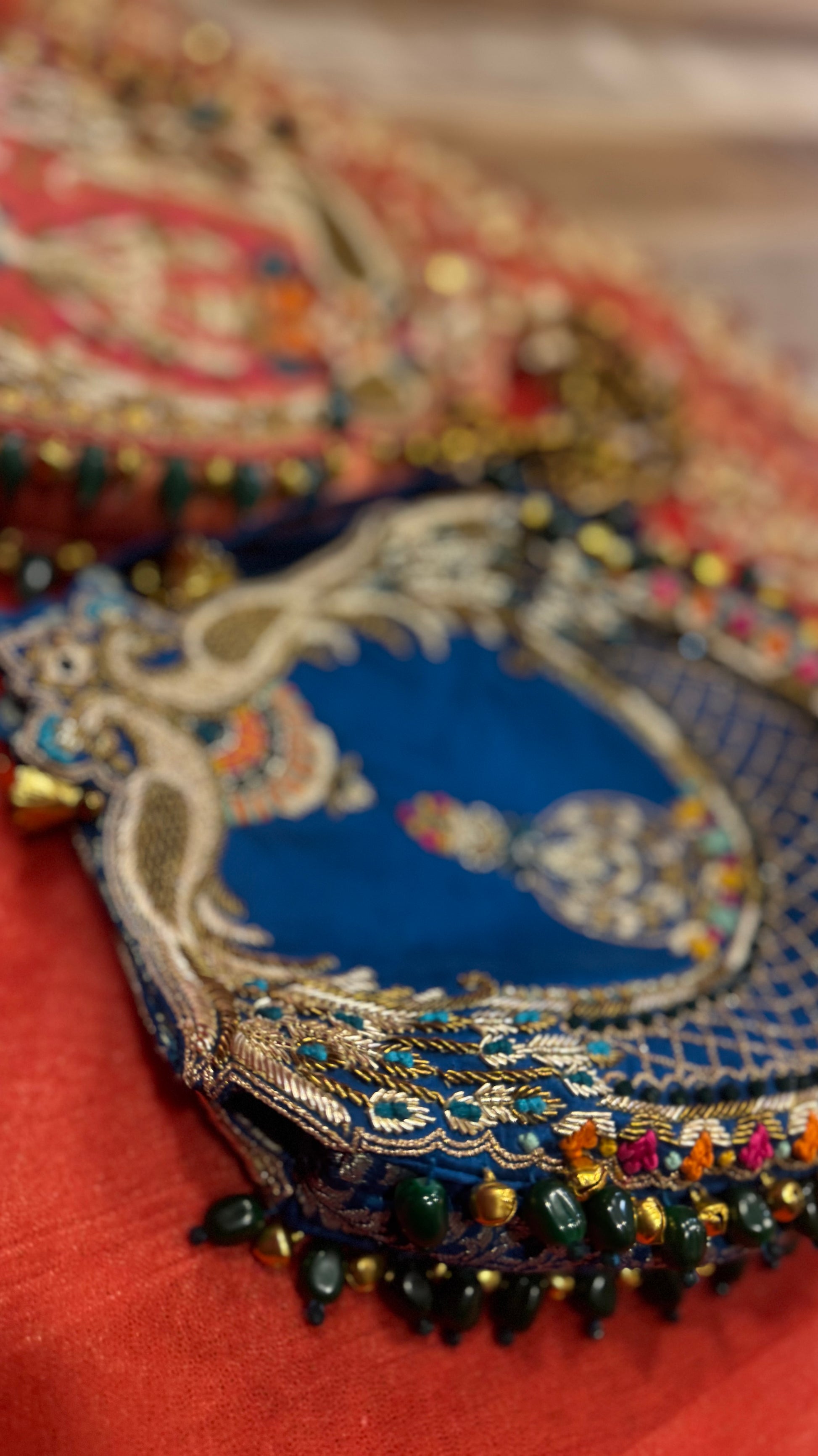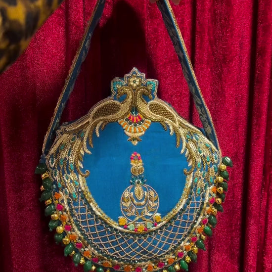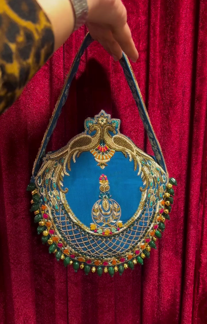 The Potli is handcrafted with intricate peacock in pure silk with detailed emerald colour tassels paired in rich hues of zardosi